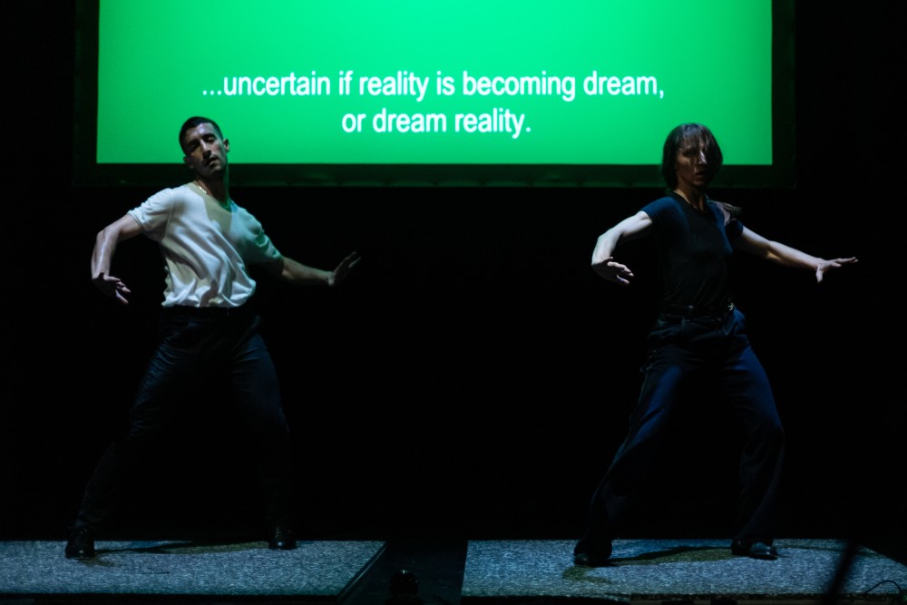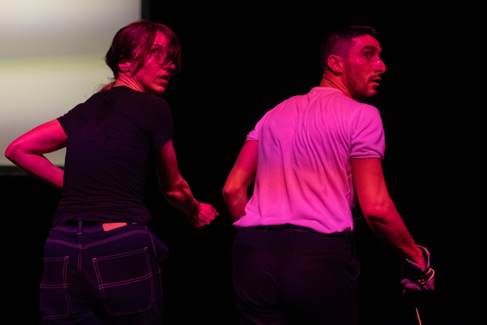 La danse et le bruitage auraient-ils des choses à se raconter ? Voici la question que se posent Ioanna Paraskevopoulou et Georgios Kotsifakis en faisant de la scène un laboratoire sonore, débordant d’objets hétéroclites. Du western au film d’épouvante, les deux interprètes reconstituent la bande-son de scènes cinématographiques projetées derrière elleux. Pour faire entendre la cavalcade d’un cheval ou le bruit des ailes au moment de l’envol, iels manient la noix de coco, le parapluie et la serviette de bain comme autant d’instruments de musique. Iels courent, tapent, frappent, frottent, et ce petit inventaire de bruitages devient un répertoire de gestes jubilatoires. Entre l’image et son envers, entre le son et sa matière, la chorégraphe athénienne interroge également notre rapport à l’archive, à la mémoire trouée, aux images incomplètes qu’il faut combler, même maladroitement. Et quand le projecteur s’éteint, c’est à l’imagination des spectateurs et des spectatrices de prendre le relais.